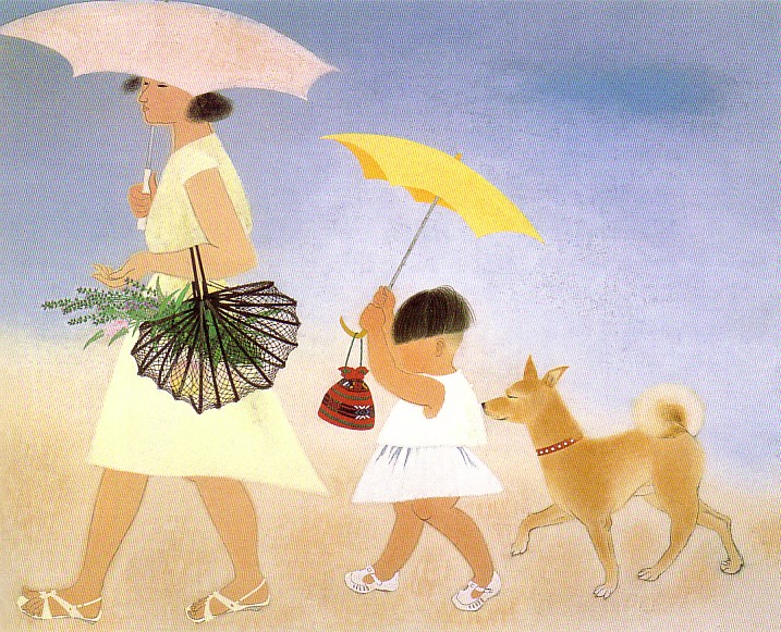 女史が描く対象についてみるに、比較的早い時期では、少女に因む多くの作例に接するが、中でも注目されるのは、院展出品作《首夏》で、野の花の咲き乱れる中に、2少女がぴたりときまった姿で、懸命に写牛している様子を描くが、日本画の蟹を踏まえながら、新しい画境を切り開こうとする心構えがよく窺える。《故郷の人達》では、熱心に編み物している少女に、焦点が置かれている。但しこの図は別の面からみると、11年の 「受洗を謳う」などと共に、女史の数少ない群像作品としても注目される。それらと年月が隔たるが、《径(こみち)》は、母のあとに少女、少女のあとに犬を歩ませ、工夫をこらした構成によって、愛情のつらなりを感じさせる。《姉妹》は、折り鶴して遊ぶ2人の緊密な布置、行き届いた描写によって、愛情につつまれた、幸福の世界が表出されている。